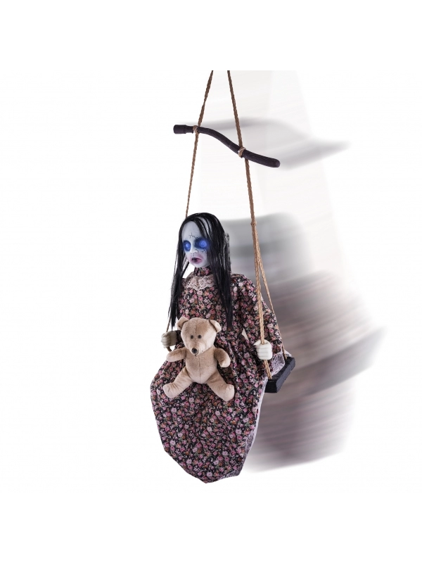 Vous cherchez une décoration animée pour Halloween qui sort de l’ordinaire ? Ne cherchez plus ! L’automate fillette avec ours en peluche est la décoration idéale pour effrayer vos invités.