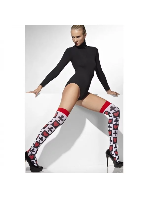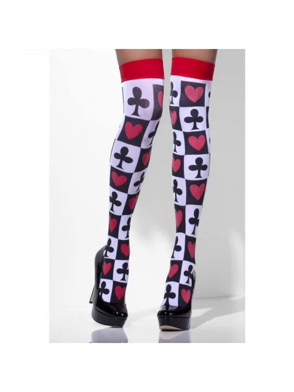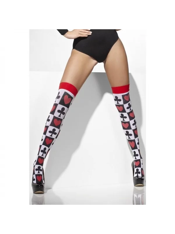Voici des bas poker Femme rouge. Arrivant jusqu’à la cuisse, ils vous couvriront du froid. On y distingue une bande rouge au sommet. Le reste est doté de carreaux avec des cases d’icônes de cœurs et de trèfles.