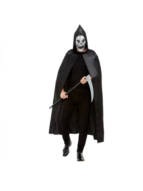 Kit Faucheuse de la mort noir, homme avec cape, masque et faux et 100 cm