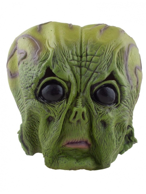 Masque Alien vert en Latex avec tête déformée et yeux exorbitants. Fan de fiction, ce masque complétera à merveille votre déguisement pour Halloween ou une soirée extraterrestre.