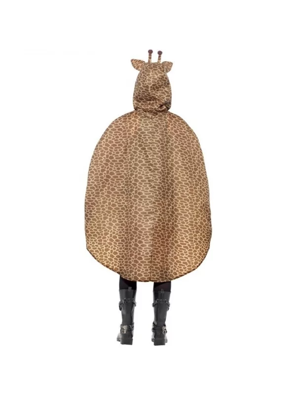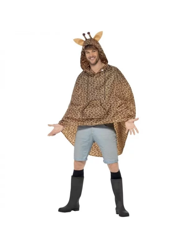 Comme capuche, on retrouve la forme de la tête de la girafe avec les oreilles ainsi que les deux petites cornes. L’imperméable original est constitué d’un tissu ayant le même aspect que la fourrure du mammifère. À noter qu’il faut prévoir un short ou un pantalon adapté au déguisement pour les pieds. Le produit est destiné pour les hommes ainsi que pour les femmes voulant un costume unique.