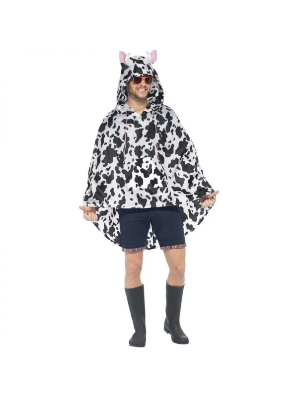 L’accessoire de déguisement est terminé par les cornes et les oreilles d’une vache sur la capuche. Par ailleurs, son nom provient des motifs du tissu qui a l’apparence de la fourrure d’une vache de noir et blanc. Le poncho party imperméable peut être porté lors d’une fête costumée.