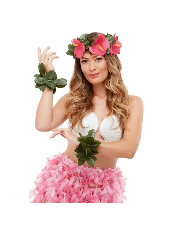 Ce set hawaïen est parfait pour vos soirées d’été autour de la piscine. Il est simple à porter et rappelle les voyages dans les tropiques. Le set comprend une couronne et des bracelets de fleurs hawaïennes en polyester, ornés de feuilles vertes et de fleurs hibiscus roses.