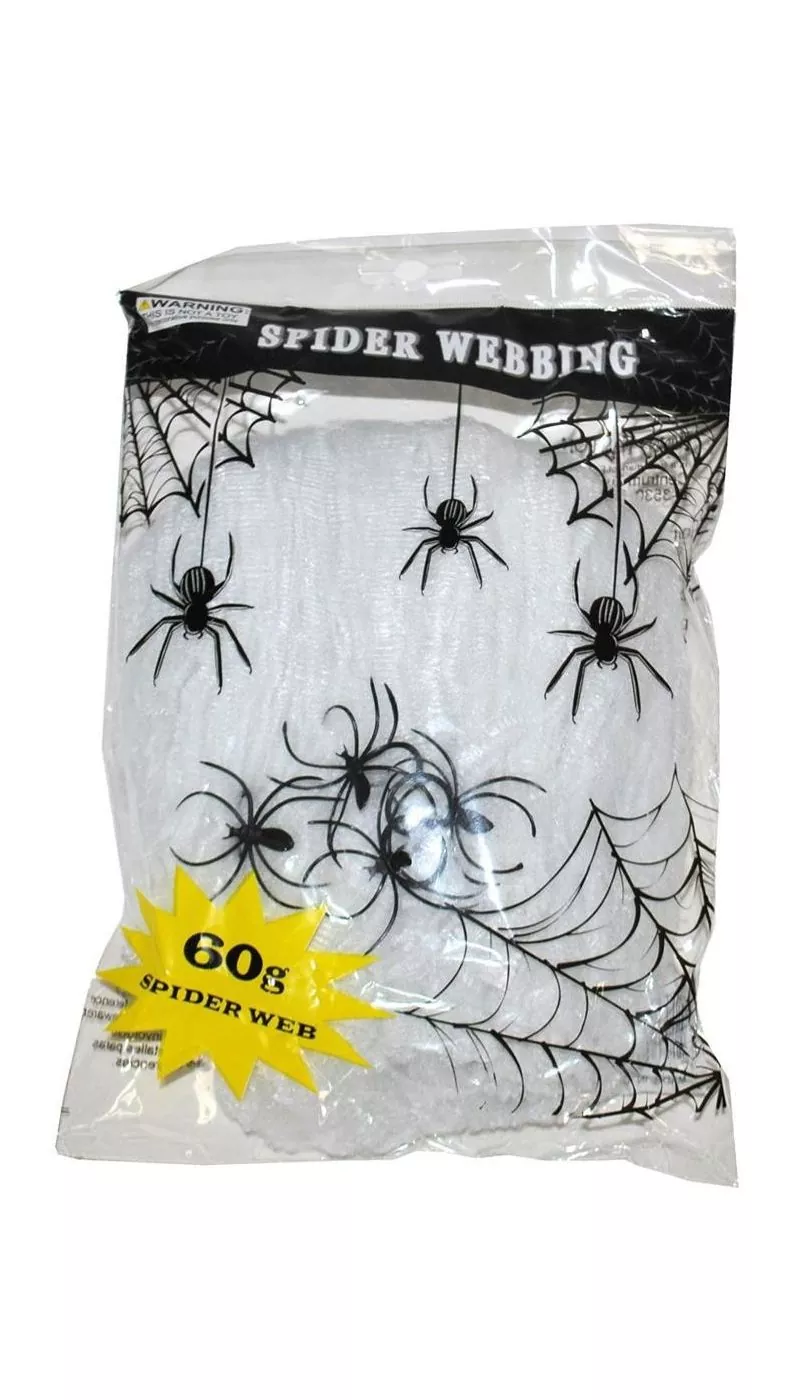 Décoration Halloween : Toile d’araignée blanche avec 4 araignées (60 g)