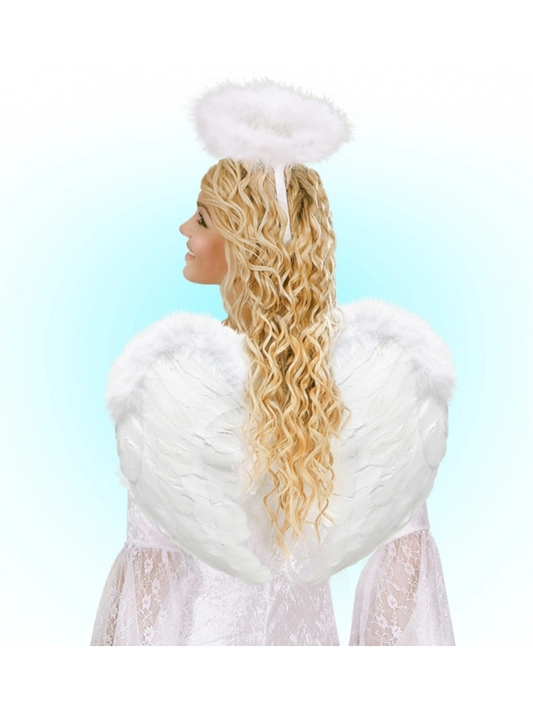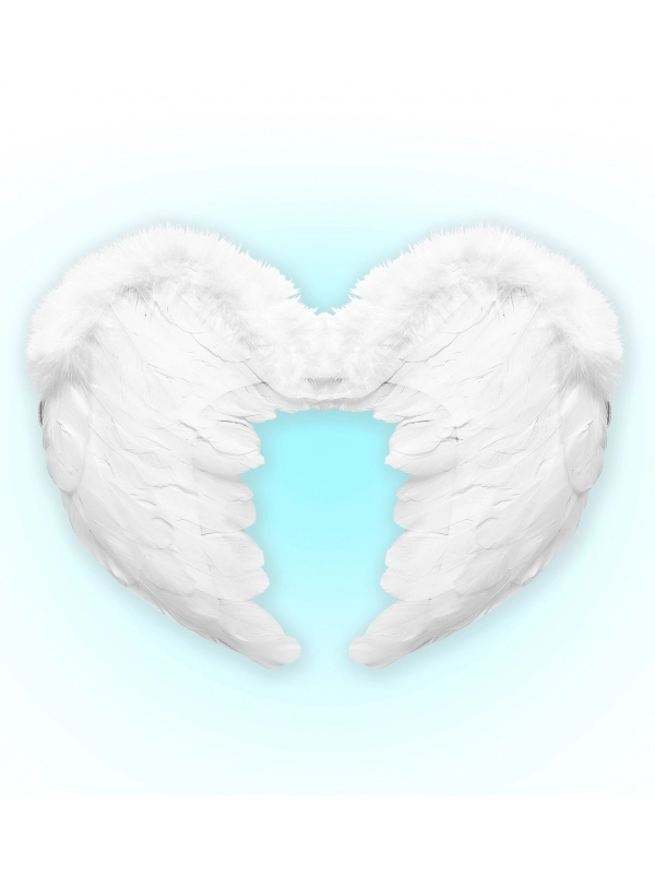 Ailes d’ange en plumes blanches 50 x 40 cm pour adulte et enfant avec élastique de maintien.