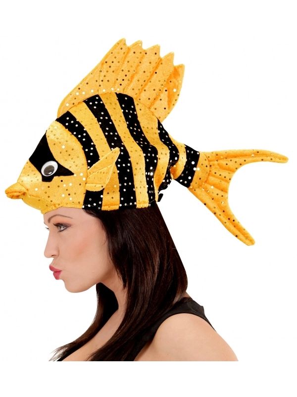 Chapeau poisson tropical orange et noir – Adulte avec sequins, nageoires et yeux.