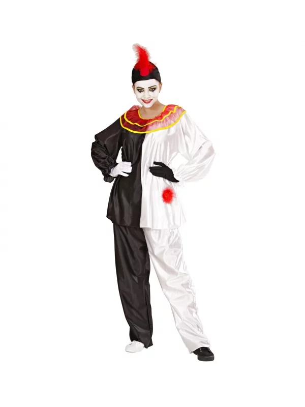 Déguisement de Pierrot noir et blanc Femme (casaque avec collar, pantalon, bonnet)