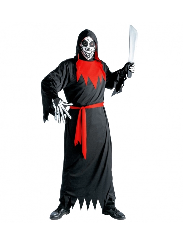 Ce déguisement de démon comprend une longue robe noire à lambeaux en sa base et au niveau des manches. La capuche profonde vient envelopper le visage et dons le masque. Une ceinture rouge viendra souligner la taille et surtout ajuster la hauteur si la robe est trop longue pour votre garçon.