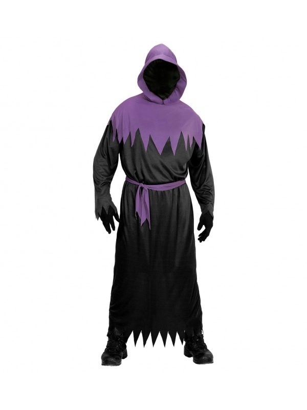- Comprend : la longue robe noir avec la capuche et la ceinture violet et le masque cachant entièrement le visage
