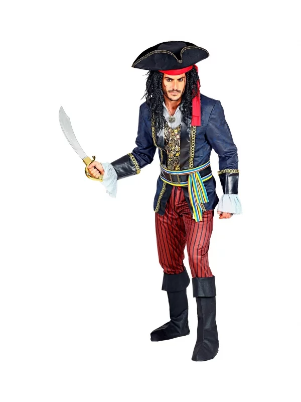 La panoplie est très complète, avec un manteau bleu à revers noir, un gilet à motifs, une chemise blanche à manches à volants, un pantalon à fines rayures noires, une large ceinture avec boucle et nœud, des couvre-bottes et le fameux chapeau noir en triangle. Les rebords du col et des manches du manteau, ainsi que la boucle de la ceinture sont brodés de motifs rappelant des chaînes en or. Pour parfaire votre costume, prévoyez une arme de pirate de votre choix : un pistolet ou une épée !