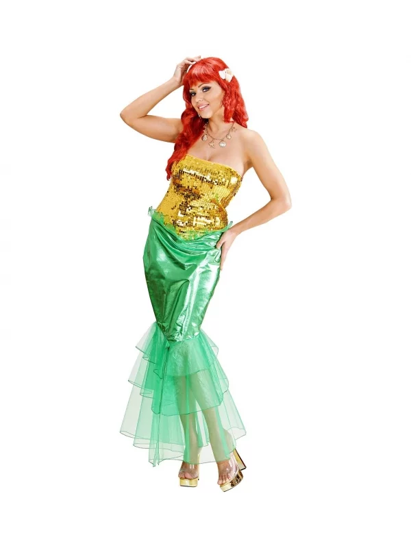 Ce costume de femme-poisson ne manque pas d’élégance. Le bustier, en doré à paillettes est assez près du corps. La jupe, en queue de poisson, brille par sa couleur vert d’eau et ses volants, qui donnent parfaitement l’illusion de la nageoire qui termine la queue de poisson.
