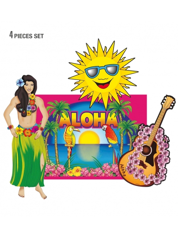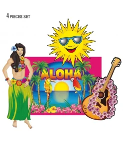 Le lot comprend une danseuse hawaïenne, un soleil, une guitare et un cadre Aloha, tous mesurant environ 50 cm. Ces décorations en carton sur le thème de Hawaï apporteront une touche colorée et festive à votre salle.